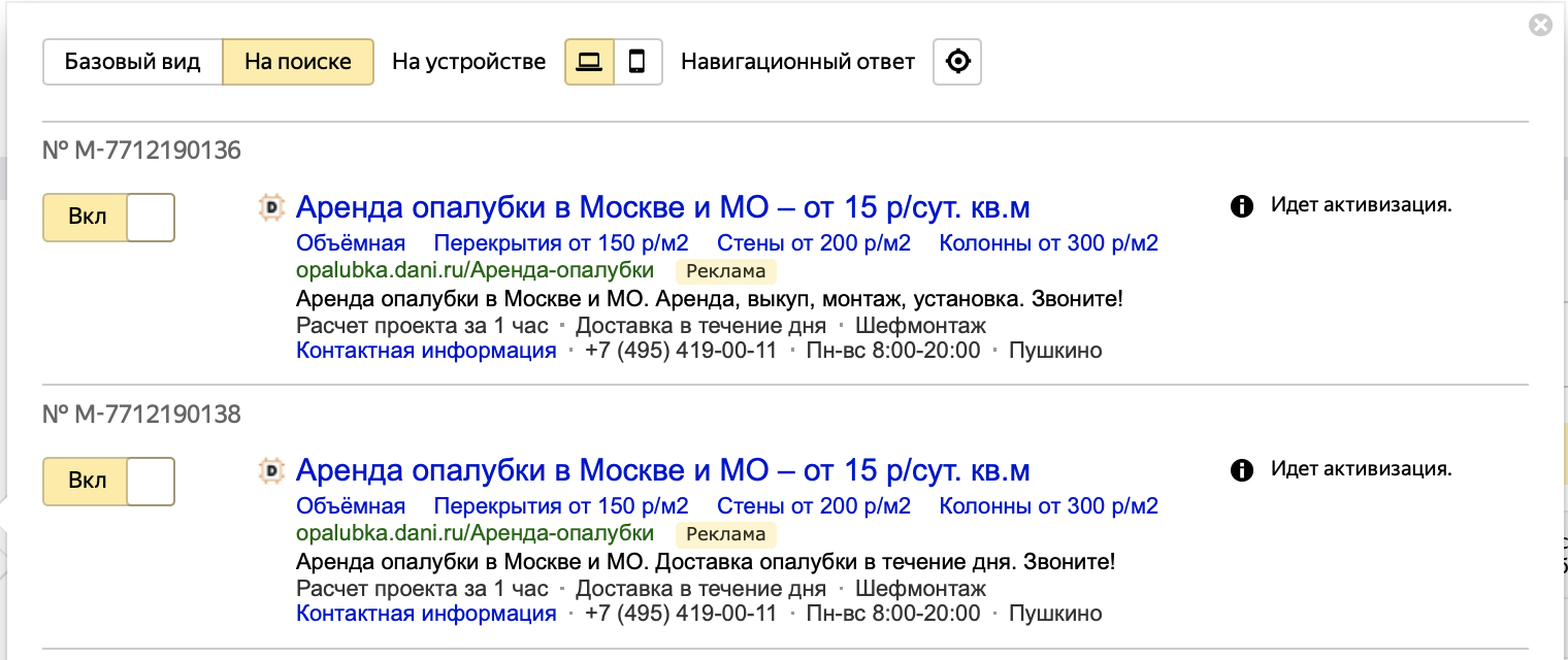 for many keywords. Ad texts did not have cl. words, extensions, and clarifications. Impressions were for information requests. Groups could contain several completely identical ads. Searching RK no one minus and did not follow the rates. No financial performance analysis has been conducted.